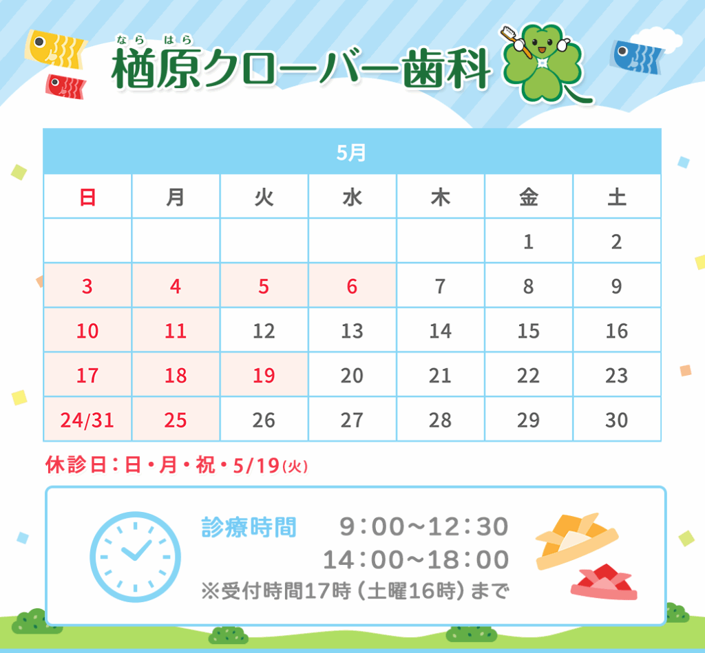 4月5月の休診日は日・月・祝、4/23(木)、5/19(火)